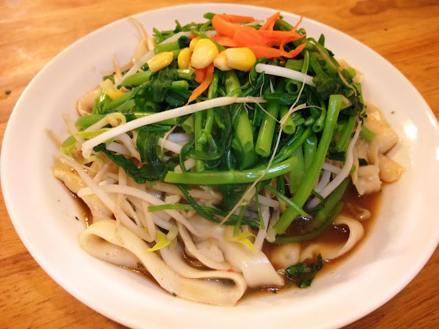 擔仔麵,重點在素燥和湯頭,淨光素食的食材通通都是天然食材,店家選材愛用新鮮的青菜,紅蘿蔔絲,豆芽菜,香菇與百頁。