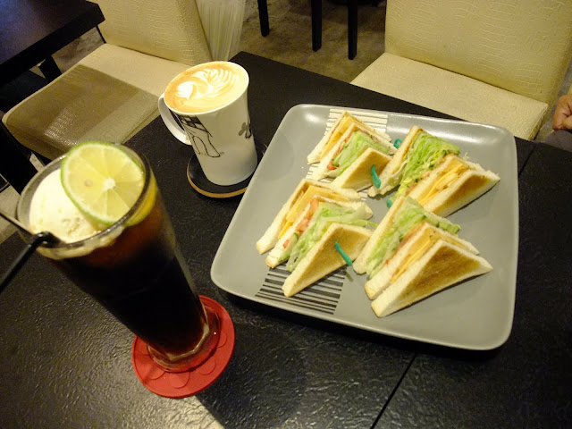 再來是漂亮的蔬果三明治,烤得有點金黃色的吐司,搭配新鮮生菜和蕃茄及素料,口感相當清爽,而且給得一點都不小氣,完全是能一個女生能吃飽的份量。