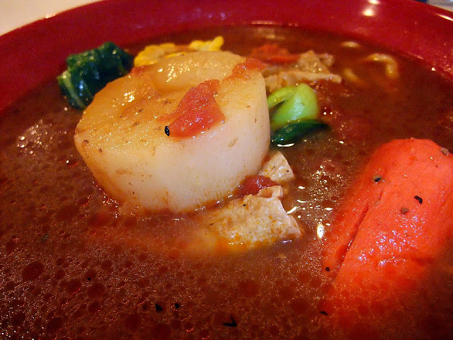 白蘿蔔與紅蘿蔔 都切得很大一塊,濃濃的高湯熬到蘿蔔都變的很軟。高湯當然少不了番茄。