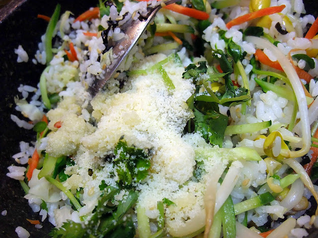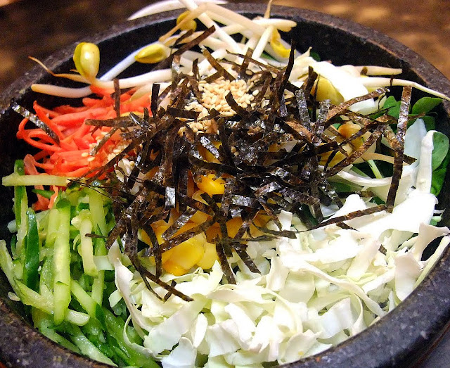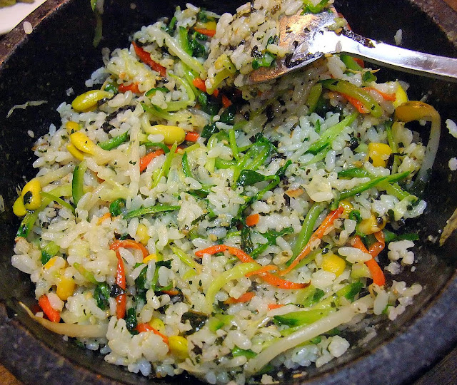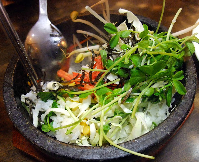 石鍋拌飯,拌飯放了不少新鮮蔬菜讓石鍋看起來美侖美奐,香椿跟起司的味道讓這鍋起司沒那麼濃烈。特別的是石鍋一上桌 起司是放一邊。