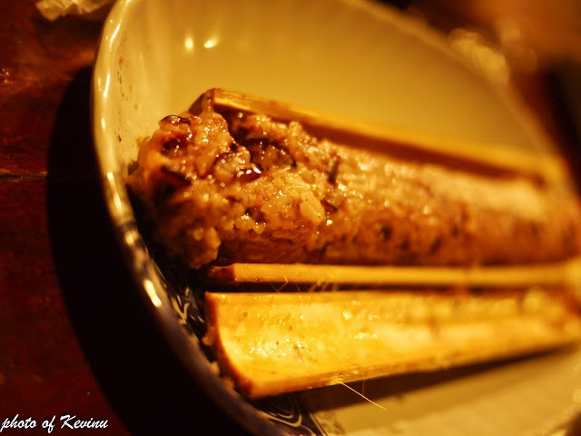 竹筒飯,裡面的米應該是不是糯米是紫米飯。老闆有將竹子敲開可以直接打開。