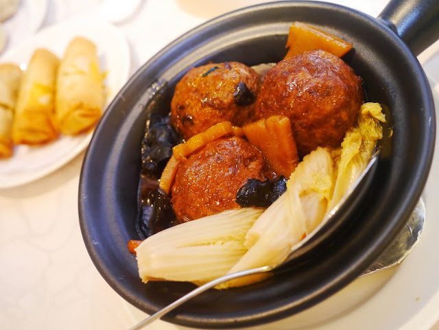 餘香獅子頭。少數菜單內有用素料的餐點。使用大料豆腐泥及少許素漿做成相當大顆的獅子頭丸,裡頭包有鬆軟可口的芋頭塊及香菇、牛蒡等。