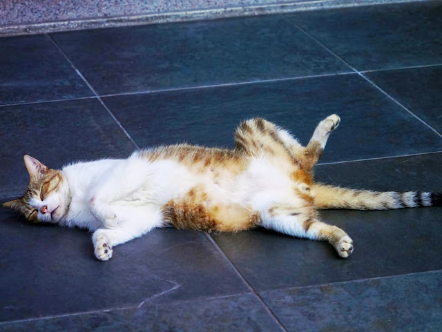 這花貓在吃完飯後就熱得四腳朝天趴著,憨直的樣子令人發笑。
